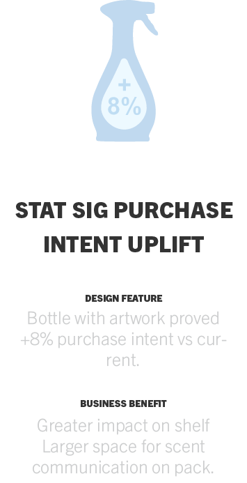 A number of research methods, both digital and in-person, were employed to assess the new package in comparison with the current (control). Highly favored competitive products were also factored in. Results from the eye-tracking and value-perception assessments are below. All tests proved statistically significant uplift in key metrics such as purchase intent, brand recognition, and scent awareness vs current package and vs competition.